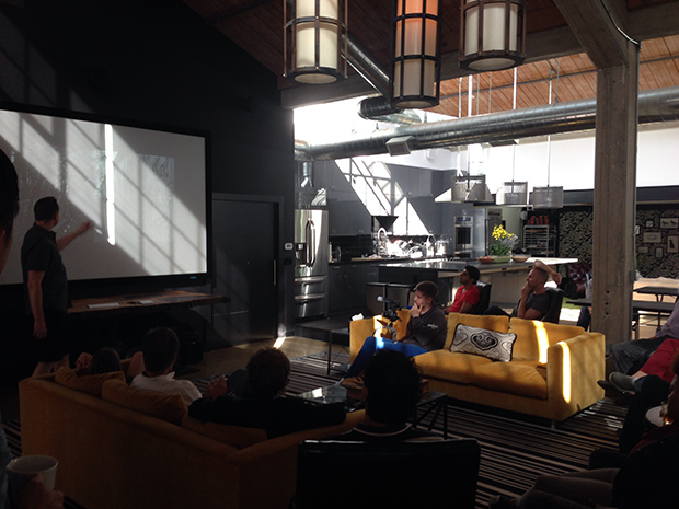 Non a caso ho scelto una delle foto che compaiono nel post di Nicola per corredare questo mio commento, proprio l’immagine che potete vedere qui sopra. Nonostante sembri mostrarci alcune persone accomodate nel salotto di una casa privata – con una tazza di caffè in mano e la cucina sullo sfondo – intente ad osservare il filmino delle vacanze del loro anfitrione, in realtà è l’istantanea di un momento di lavoro. Open friday, lo chiamano.