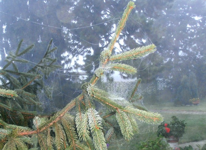La nebbia è proprio arrivata presto quest’anno! Stamattina ci si sentiva improvvisamente catapultati nell’autunno. Però quel ricamo di ragnatele era bellissimo sui tuoi pini! La natura ci stupisce sempre…