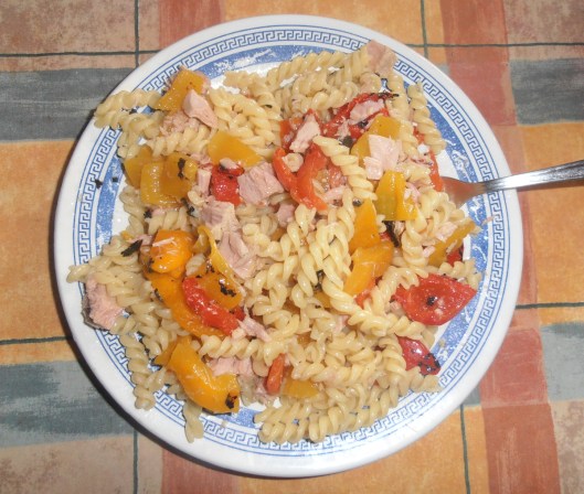 Così, ho aperto l’anta della dispensa e fatto un rapido inventario delle scorte disponibili. Mmm…. pasta, piselli, tonno, peperoni grigliati sott’olio.