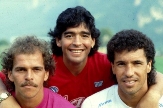 Da sinistra, Ricardo Rogério de Brito, detto Alemão, Diego Armando Maradona e Antonio de Oliveira Filho, detto Careca, campioni d’Italia con il Napoli nel 1989-90.