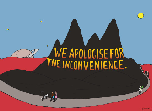 Qui sopra è raffigurato ciò che, secondo quel geniaccio di Douglas Adams, costituisce il messaggio finale di Dio al creato (giusto per non trascurare un minimo di autoreferenzialità, vi si era accennato qui). In italiano viene tradotto in “scusate il disturbo”, che fa venire in mente un cartello stradale da lavori in corso. Ma in modo più letterale può anche essere inteso come “ci scusiamo per l’inconveniente”, che a me suggerisce un seguito da vecchia televisione: le trasmissioni riprenderanno il più presto possibile.