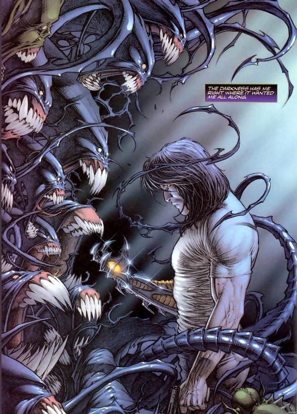 L’immagine qui sopra è una tavola tratta da The Darkness della Top Cow ed è probabilmente stata disegnata da Marc Silvestri. Ritrae Jackie Estacado, possessore della Tenebra, di fronte a una manifestazione di essa.