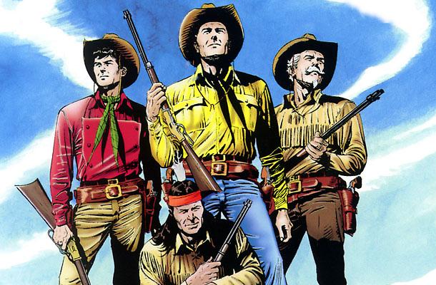 Tex Willer e i suoi pards, in un disegno di Claudio Villa tratto da qui, e una riproduzione moderna a basso potenziale (di libera detenzione e vendita) dell’iconica pistola Colt .45 SAA.