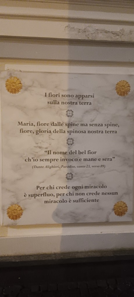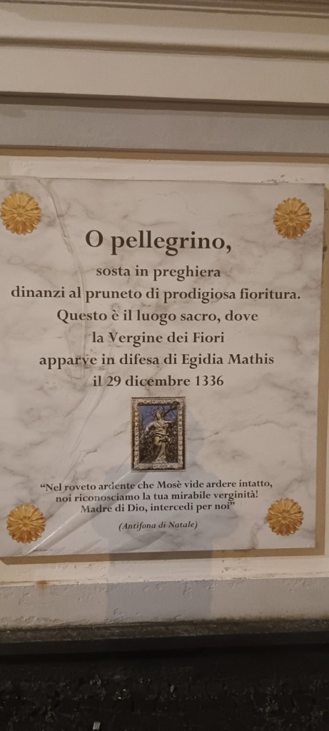 Poteva forse finire qui? No che non poteva. L’elegiaca favoletta nacque per giustificare il fatto che, in quel preciso punto, sorge un pruno selvatico che ha la particolarità di fiorire d’inverno; il che è stato considerato, e viene considerato tuttora, miracoloso.