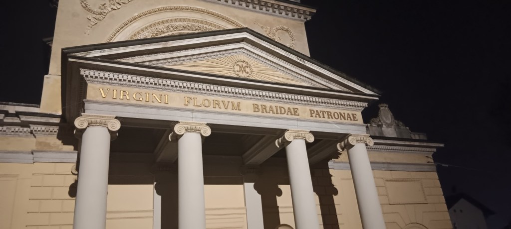 Il latinorum ci riconduce all’antico nome di codesta cittadina, e come si può notare ci troviamo di fronte all’ingresso di una chiesa, anzi, di un santuario: il santuario della Madonna dei Fiori di Bra. Per la precisione, del santuario vecchio, perché a fianco ne esiste uno edificato più di recente, un’autentica pacchianata.
